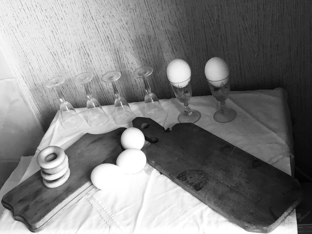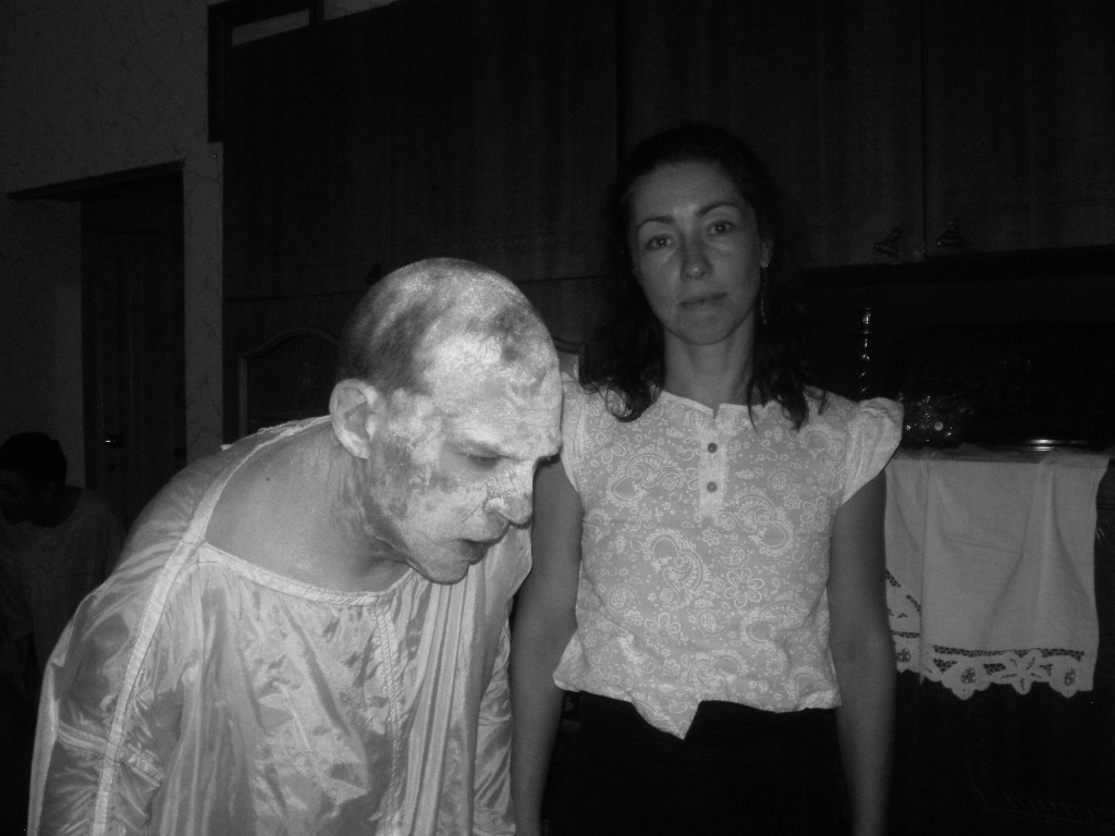 У білому з вимазаними борошном обличчями. Наче після лоботомії, ніяк не реагували на те, що відбувається. Овочі у борошні. Їх привязано до комоду тонкими білими ниточками. Напевне, щоб не відлетіли.